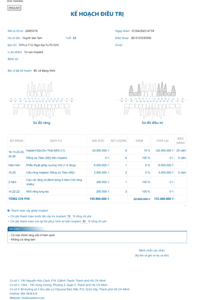 Cô chú anh chị sẽ nhận được phiếu kế hoạch điều trị đầy đủ như hình bên dưới và không bắt buộc điều trị tại Nha Khoa I-Dent