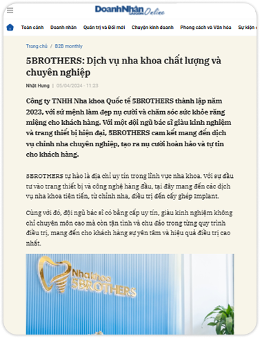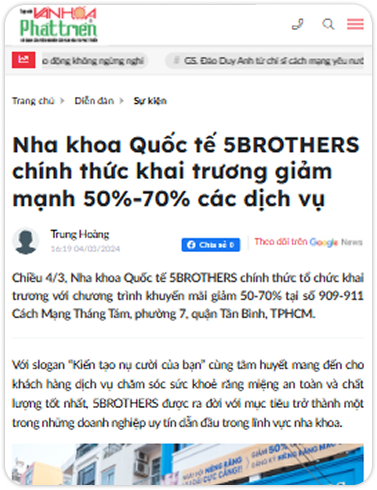 Trồng răng Implant tại Nha khoa 5Brothers nhận được sự đánh giá cao từ các chuyên gia trong ngành nha khoa và truyền thông. Các phương tiện báo chí đã phản ánh những ưu điểm vượt trội của công nghệ trồng răng hiện đại mà chúng tôi áp dụng